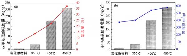 活性炭的空氣活化產生更多的分層孔結構,具有更高的表面積和更豐富的表面官能團。更多數量的孔納米結構可為染料分子提供大量吸附位點并改善其吸附能力。富含表面的官能團可促進活性炭在水中的分散,使活性炭在吸附過程中與染料完全接觸。這些性質在空氣活化后賦予活性炭較好的亞甲基藍吸附性。在300℃至450℃的溫度下空氣活化后,盡管由于350℃活化導致的表面積略微增,但吸附容量是炭化原料的4.8倍。這種情況表明,表面積在提高空氣活化后活性炭的吸附能力方面起著次要作用。表面性質的變化可能主要影響空氣活化后活性炭的吸附性能。結果得到了亞甲基藍吸附容量與受空氣活化溫度影響的活性炭表面積和氧含量的相關性的支持(圖7)。亞甲基藍的改善的吸附性能與與活化溫度相關的氧含量的變化趨勢很好地對應(圖7a)。而隨著活化溫度的升高,吸附容量的增長率遠高于表面積(圖4b)。