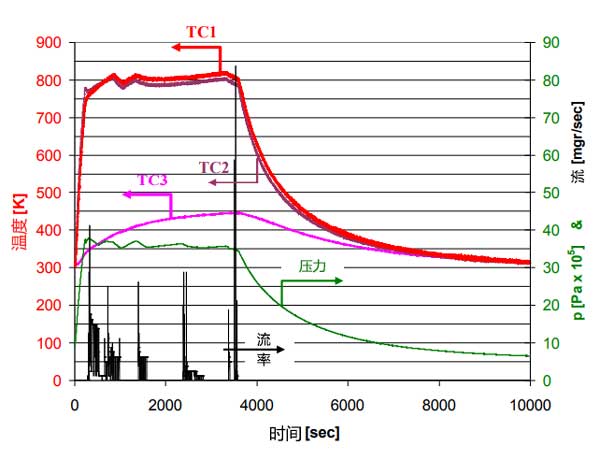 排出壓力約為3.5MPa的實驗結果如圖4所示。250秒后,加熱功率為500W,中心溫度超過476℃,而電池底座溫度則為76℃。然而,將電池達到其穩(wěn)態(tài)溫度分布需要大約60分鐘,其中電池基座中的溫度為166℃。活性炭的溫度不允許超過526℃。 60分鐘,加熱功率逐漸降低,以保持最高溫度低于526℃,壓力高于3.5MPa。由于電池基座的溫升速率隨時間降低,輸送的氮量也減少了。因此,在15分鐘后結束放電階段僅從活性炭吸附池釋放4.6g氮。圖4中的冷卻階段持續(xù)約100分鐘,并且如果放電階段在15分鐘后結束(此時基礎溫度僅為126℃),則可以減少冷卻階段;钚蕴恐械募訜岷屠鋮s速率以及溫度分布與數(shù)值分析估計的相似。這表明簡化的數(shù)值傳熱分析為吸附池中的傳熱提供了令人滿意的估計。