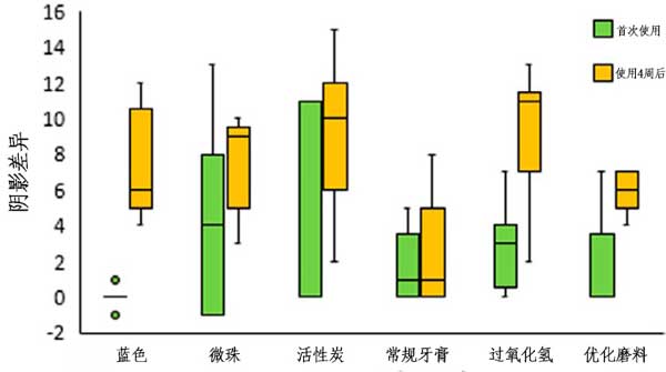 圖2:美白效果由每種牙膏的基線與首次使用后和使用四周后之間的色調單位差異表示。