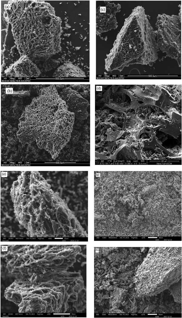 掃描電子顯微鏡圖像顯示在圖1a-h中;钚蕴康牧姿崽幚韺(dǎo)致具有可見孔隙率的材料(圖1a-c)。然而,仔細(xì)觀察后,孔隙結(jié)構(gòu)和尺寸是不同的。20%濃度改性后的活性炭具有稍微細(xì)長(zhǎng)的孔,40%表現(xiàn)出均勻的圓形孔,而60%顯示出細(xì)長(zhǎng)和圓形毛孔的混合。這些觀察結(jié)果表明,不同濃度的磷酸活化的活性炭具有不同的物理屬性。在這種情況下,磷酸是活化劑,并且在加熱時(shí)產(chǎn)生孔道,因?yàn)樗鼜奶贾幸莩,從而帶走一些萃取劑。圖1d描繪了具有小孔的粗糙紋理,圖1e顯示了類似巢的類型的孔,圖1f顯示了孔的破壞和變寬?捉Y(jié)構(gòu)和孔體積的變化可歸因于活化劑的強(qiáng)度增加。濃度較高的硝酸會(huì)破壞表面基團(tuán)。因此,需要使用最佳濃度的活化劑來防止損害吸附劑的表面特性。濃度太高可能導(dǎo)致結(jié)合官能團(tuán)的提取,使吸附劑吸附性差。
