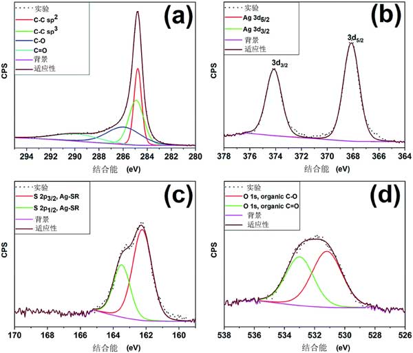圖2顯示了所制備的活性炭樣品的組成元素的XPS光譜。XPS測量圖顯示碳,銀,硫和氧作為構成元素的存在。S 1p光譜配有多個高斯分量,這些物種通常存在于活性炭表面上。圖2(b)分別顯示了多個峰,它們與零價態的銀原子一致。S 2p光譜的高分辨率光譜的反卷積,如圖2(c)所示,顯示兩個自旋軌道分裂為〜1.2 eV的峰。O 1s光譜顯示出不對稱的曲線,表明活性炭表面存在多種氧物質(圖2d)。光譜的反卷積產生兩個,其可分別歸因于活性炭表面的C-O和C O物質,因此不存在金屬氧化物物質。總之,XPS結果表明硫醇鹽配體保持附著在銀簇表面的表面上,并且在活性炭樣品中不發生銀原子的氧化。