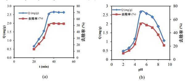 圖2:接觸時間(a)和pH(b)對活性炭殼聚糖復合膜對Cd2 +的吸附容量(Q)的影響。