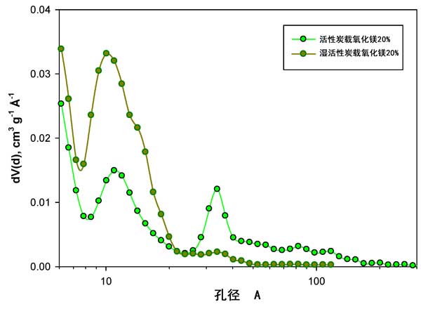 初步的TG分析20%氧化鎂負載量的活性炭與釋放的氣體進行IR分析表明,硝酸鹽的分解在400°C以下完成。在此溫度以上,僅發生了Mg(OH)2緩慢轉變為MgO的情況。因此,所有在600°C下處理過的催化劑均由分散在活性炭上的MgO組成,而沒有硝酸鹽前體鹽的殘留。圖1報告了不同負載下的活性炭和負載了氧化鎂的活性炭催化劑的孔徑分布(PSD)。