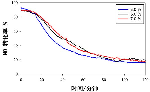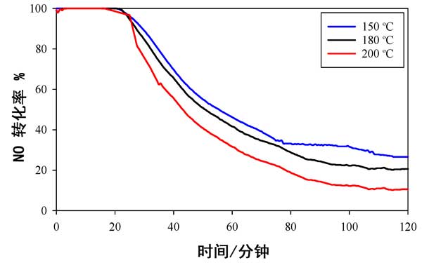 使用活性炭載錳氧化物催化劑時,不同溫度下NO轉化率數據與時間的關系如圖2所示。它用于提供可以與以前發布的數據進行比較的基線數據。在所有溫度(150°C,180°C和200°C)的前20分鐘內,幾乎有100%的NO轉化發生,但在此初始階段后NO轉化迅速下降,并且在2小時的測試后,轉化率不足20%。活性的溫度依從性依次為150°C>180°C>200°C。