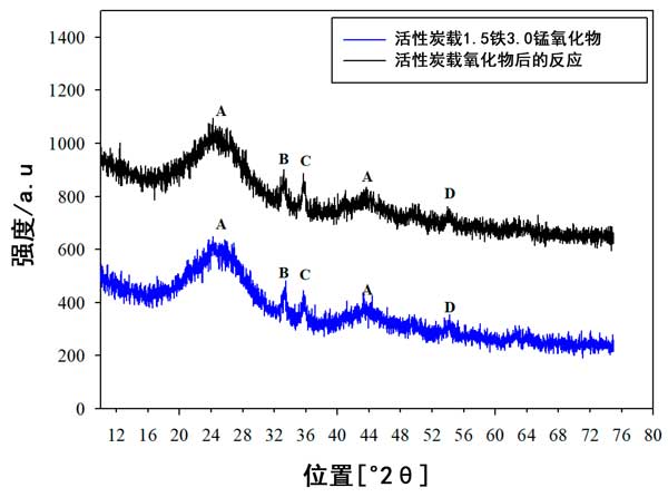 來自活性炭載鐵錳氧化物的XRD數據顯示在圖5中,其中已鑒定出主要峰。在2θ=24°和2θ=43°處的寬峰(標記為A)與無定形碳的峰一致。它們的位置和寬度在新鮮和經過測試的催化劑中都相同,這表明活性炭無定形結構的穩定性。在新鮮催化劑和測試催化劑中,在2θ=33.5°,2θ=35.1°和2θ=54.3°處分別出現了另外三個峰(分別標記為B,C和D),并且位置或峰強度沒有明顯變化作為反應測試的結果。2θ=33.5°(峰標記為B)處的峰歸因于Fe 2 O 3 和在2θ=35.1°和54.3°的峰歸因于Fe 3 Mn 3 O 8,盡管在新鮮和測試的催化劑中這些與鐵有關的峰的強度和寬度相同,但是由于XRD峰較弱,因此很難確定在測試過程中鐵和錳的結晶度是否發生了變化。然而,結合的鐵氧化物與錳氧化物確實原因形成Fe 3的Mn 3 ö 8固體溶液,其可在的活性炭載鐵錳氧化物催化劑的NO轉化。