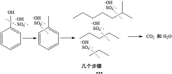 圖4顯示了苯酚的降解過程。首先破壞連接苯酚中羥基的化學鍵,然后打開苯環以形成通過單鍵連接的單鏈。隨著反應的進行,單鏈之間的化學鍵被破壞,并形成具有較少碳原子數的單鏈。將鏈重組為新的長鏈的過程是由于氧化劑劑量不足。然而,隨著反應的進行,諸如這些短鏈和新形成的長鏈的中間體被進一步降解。在此過程中,一些單鏈會隨著反應時間的增加而重組形成一條更長的新單鏈。隨著這一過程的繼續,長單鏈逐漸分解成短鏈,然后苯酚礦化成二氧化碳和水。