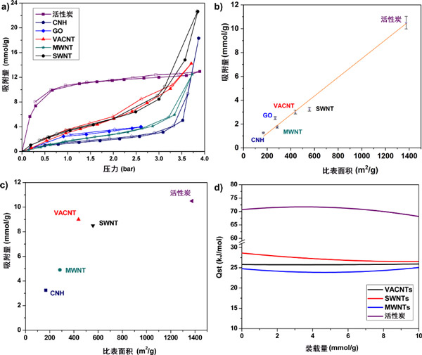 圖1顯示了不同吸附劑的示意圖。活性炭具有無序的孔結構(圖1a),其孔隙度是由基本結構單元的無規堆積引起的,該結構單元可能是小于10-20環的平面芳族結構,分布在2-4層上或有缺陷的微石墨烯層。具有這種形態,它代表具有擴展的結構紊亂的類型學碳吸附劑。氧化石墨烯具有2D分層結構,如圖1b所示。合成氧化石墨烯的起始材料是石墨,石墨的氧化引入了氧官能團,繼而增加了層間距并使材料變成親水性。隨后的剝落步驟將各層分開,從而顯著增加其可訪問的表面積,從而導致單層或少層氧化石墨烯的形成。在我們以前的工作中,通過XPS分析,我們發現氧化石墨烯上存在的氧官能團是羥基和羧基的形式。材料在孔隙率和功能化程度方面的可調性使氧化石墨烯成為親水性碳吸附劑的原型,因此對于研究2D材料中的氣體吸附也很有趣。碳納米角具有管狀結構,在一端具有封閉的錐形尖端結構(圖1c)。單個碳納米角通常為單壁,內徑為2-4 nm。碳納米角的獨特特征是直徑為50–100 nm的剛性球形聚集結構。合成后的碳納米角關閉,氣體分子無法進入碳納米角內部。氧化處理,例如在空氣中加熱,O 2 或CO 2用于打開碳納米角,從而將可及表面積增加3-4倍。碳納米角具有微孔的組合,對于氣體吸附應用很有趣,因為它們可以大量生產且純度高。