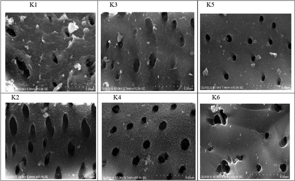 對原始活性炭(圖3中的K1)的掃描顯示出相當均勻的孔。活性炭的結構可以看作是薄片,為不規(guī)則分布和各種尺寸的孔提供了較大的吸附面積。表面上的大多數(shù)可見孔都在5微米范圍內(nèi),這與對椰殼活性炭的預期一致,而在這5微米孔內(nèi)可以看到小于1微米的較小孔。圖3中的K2顯示了在氯酸鹽吸附到表面活性部位后活性炭表面的變化。這些孔有變化的跡象,因為其中一些吸附氯酸鹽,而其他孔被氯酸鹽和氯化物分子阻塞。在10,000倍的放大倍率下,可以觀察到小孔周圍和大孔入口處的沉積,因為預計表面活性基團會大量存在于這些區(qū)域。活性炭的酸性再生極有可能形成了表面活性部位,從而增強了活性炭吸附大量氯酸鹽的能力。