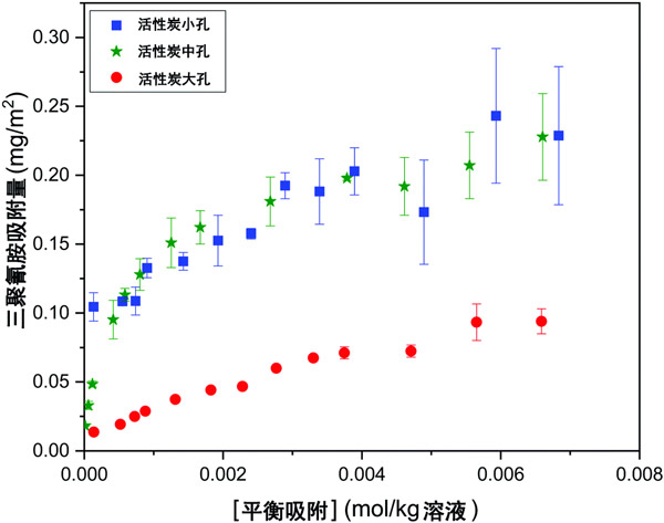 圖2:三聚氰胺在30°C下在三種活性炭的吸附等溫線,通過活性炭表面積標準化。