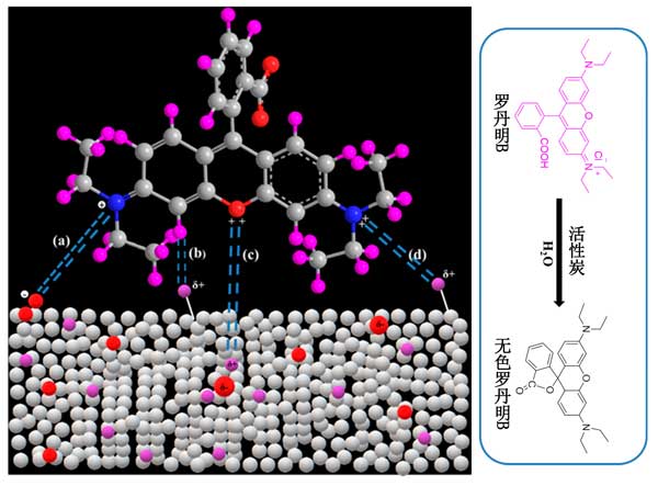 羅丹明B降解機理示意圖;钚蕴康谋砻嫔洗嬖趲讉官能團,它們可以與羅丹明B染料分子相互作用?赡艿南嗷プ饔煤喪鋈缦拢(a)活性炭的–COOH基團與羅丹明B的負電性基團之間的相互作用,(b)活性炭的–OH基團與羅丹明B的芳環之間的氫鍵,(c)氫鍵活性炭的–OH基團與羅丹明B的x噸基團之間存在(d)活性炭和羅丹明B染料分子的表面官能團之間的靜電相互作用。