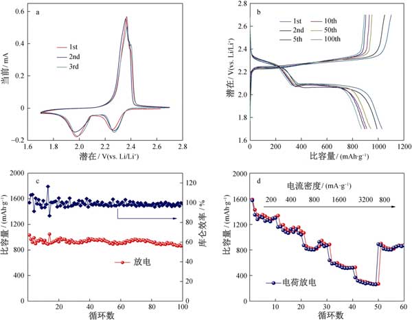 為了評估活性炭作為陰極的電化學性能,將鋰箔作為陽極組裝到鋰硫電池的紐扣電池中。用于第一,第二和第三個循環的循環伏安圖(CV)曲線上在0.05毫伏·秒的掃描速率的電位窗口進行(圖2A)。在第一循環期間,觀察到兩個陰極峰在2.26和1.97 V,CV曲線中最初的幾個循環幾乎重疊,這表明循環穩定性極佳,容量保持率相對較高;钚蕴康暮汶娏鞒潆/放電曲線和循環穩定性的測試中,如在圖中所描述2B、C;钚蕴侩姌O的首次放電容量為1045 mAh·g -1,約為硫理論容量的62.5%。此外,活性炭電極在第100次循環時也顯示出869.8mAh·g -1的放電容量。如圖2d所示測量活性炭的倍率性能,在200–3200 mA·g -1下表現出1260、1050、806、513、290 mAh·g -1的可逆放電容量。此外,當電流密度達到800 mA·g時,活性炭陰極的放電容量為802 mAh·g -1。多孔活性炭材料表現出中等的鋰硫電池電化學性能,顯示出高性能鋰硫電池的潛力。