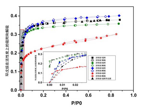 通過氣孔法對環戊烷吸附/脫附前后的活性炭進行分析,可以進一步洞察一些已經發表的研究,這些研究觀察到了活性炭中環戊烷的捕集,但沒有確定相關的孔隙度。活性炭對環戊烷水合物結晶的影響時,液體環戊烷被活性炭吸收,因為直接吸收比蒸汽吸附更容易在工業過程中實施。為此,在初級真空下于12小時內純化后,向微孔活性炭吸收了一部分液體環戊烷。