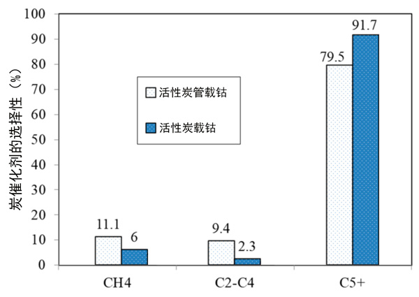 費托合成試驗是在210℃和2.5MPa的內徑為12mm的不銹鋼固定床管式反應器中進行的。將0.5g催化劑與5.0g碳化硅稀釋劑的反應混合物裝入反應器中。催化劑在425℃下在N2中的33vol%H2中原位還原10小時。還原后,將反應器冷卻至180℃,并將H2/N2氣體混合物切換為合成氣(H2:CO為2∶1)。在合成氣加壓至2.5MPa然后在4小時內重新加熱到210°C來完成反應;钚蕴枯d鈷催化劑,活性炭納米管載鈷催化劑的CO轉化率分別為13.1%,6.7%。產物選擇性的結果在圖2中給出。與活性炭管樣品相比,活性炭產生更高的C5+和更低的CH4選擇性,這對氣體產物(C1-C4)也產生最高的選擇性。