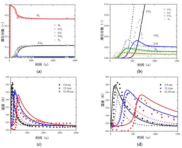 圖1:活性炭和活性炭摻沸石的突破曲線(a,b)和溫度曲線(c,d)。