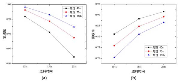 活性炭凈化時間的影響如圖2所示。當吹掃時間從40秒增加到70秒時,氫氣純度提高了0.44–1.35%,氫氣回收率降低了2.61–6.57%。當吹掃時間從70秒增加到100秒時,氫氣純度提高了0.21-0.76%,氫氣回收率降低了2.91-7.19%。隨著吹掃時間的增加,在吹掃步驟中氫氣的摩爾分數增加,因為更多的不純氣體從吸附劑中解吸出來。因此,隨著吸附劑的循環利用,這些雜質的摩爾分數降低,因此隨著凈化時間的增加,氫純度也隨之提高。但是回收率下降了,當進料時間短并且吹掃時間增加時,氫純度變化率降低,并且氫回收率變化率增加。